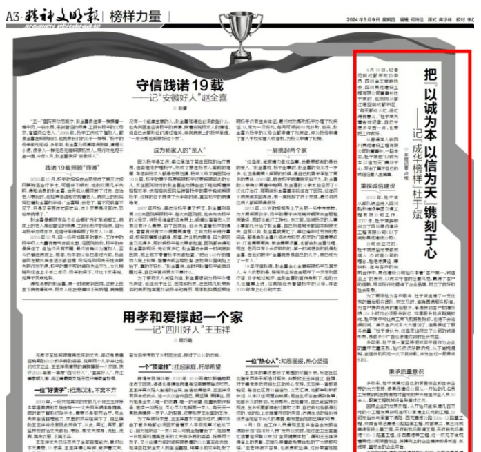 2024年05月09日,我司董事長(zhǎng)杜于斌有幸榮獲《精神文明報(bào)》榜樣力量欄榮譽(yù)。杜于斌,作為我們...